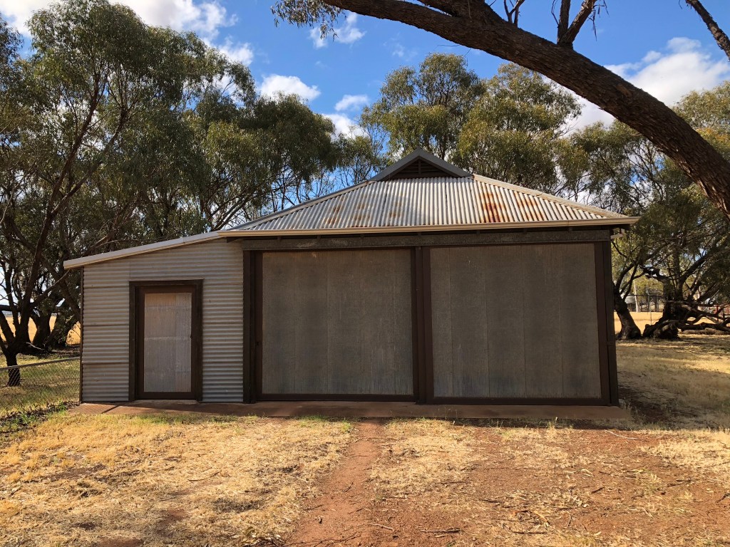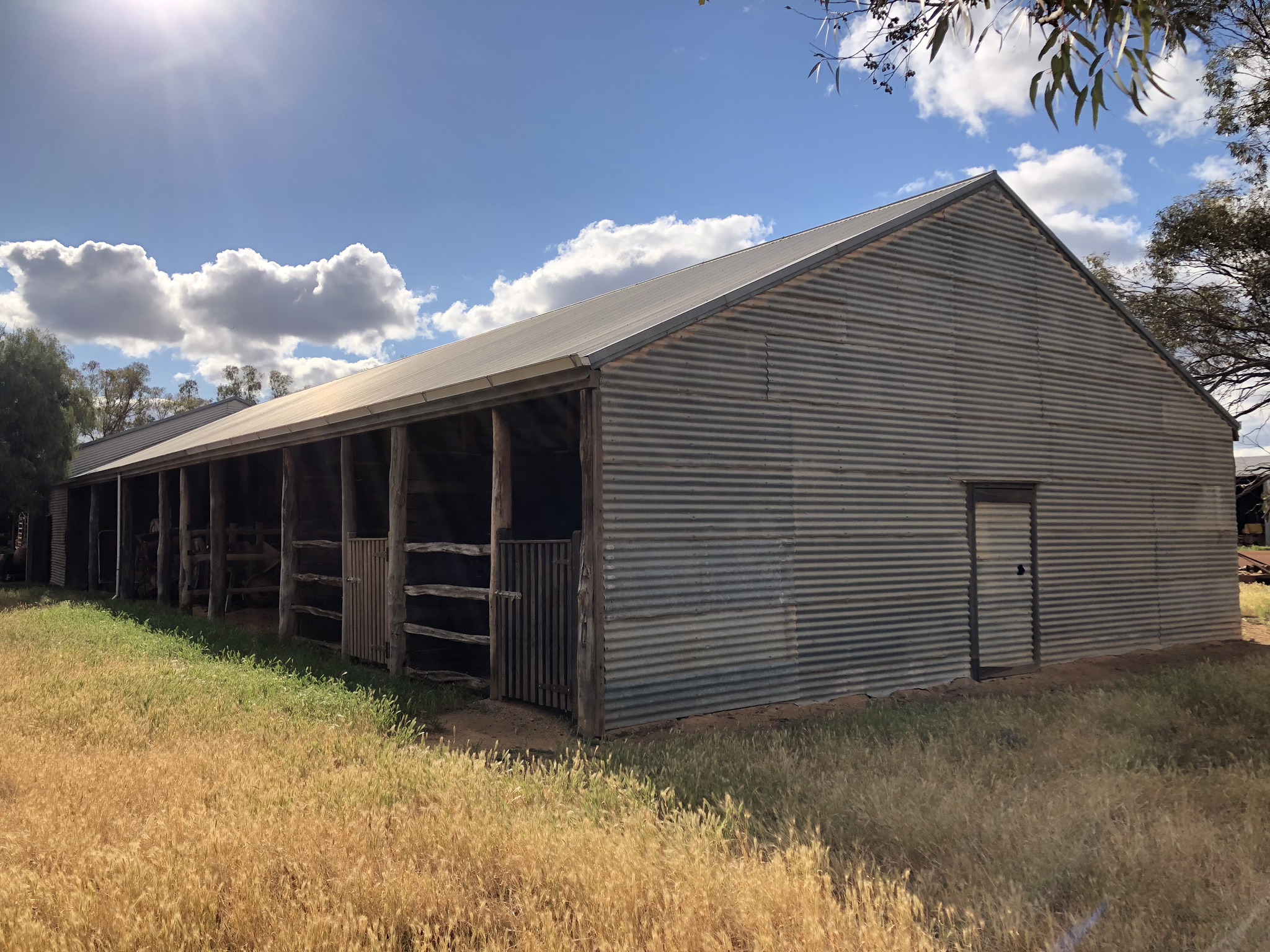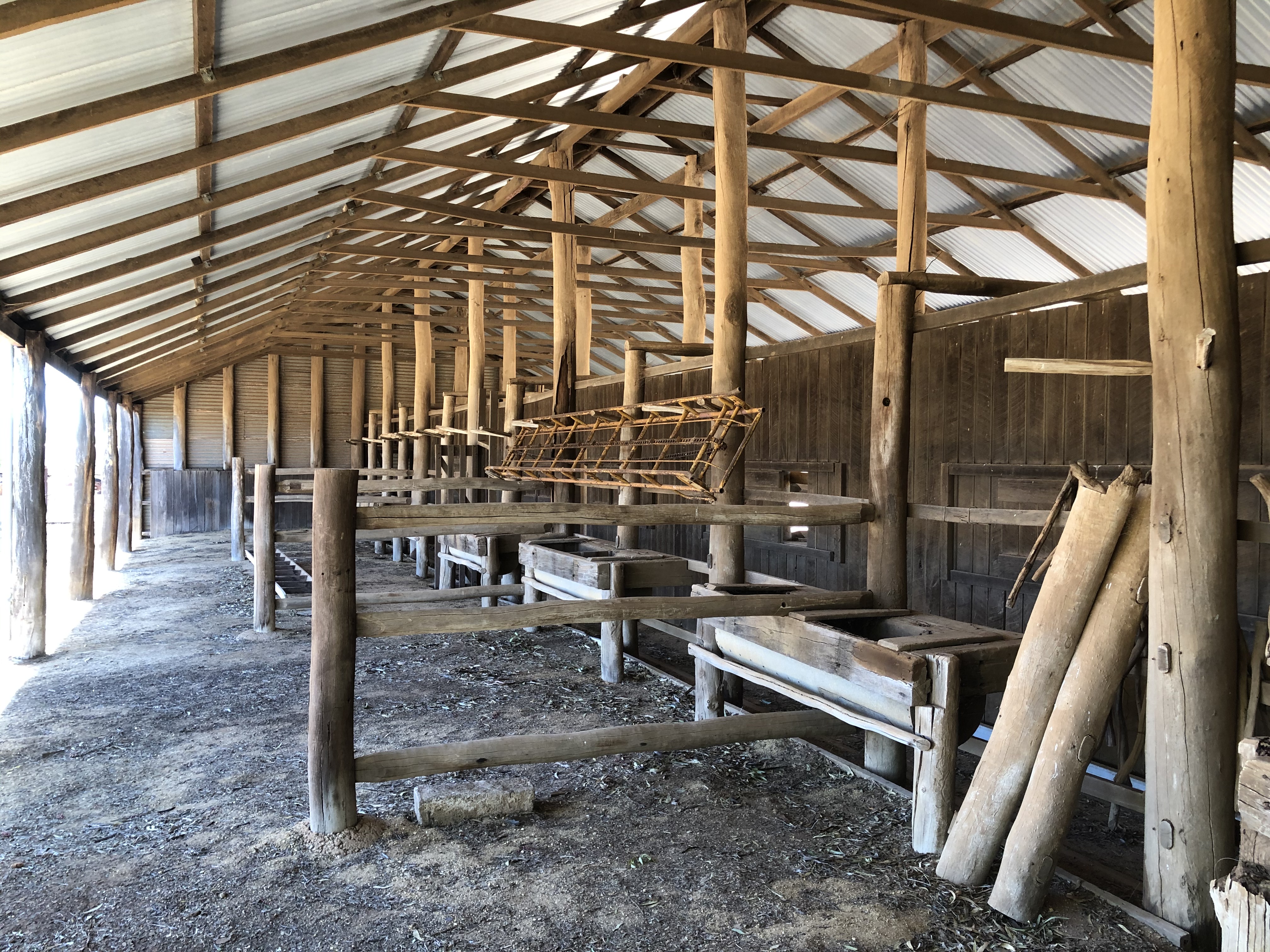 The Shearing Shed is a large rectangular corrugated iron shed with a corrugated iron gable roof. Internally, centrally placed bush poles with a mixture of timber and steel trusses support the roof. Three rows of magnificent salmon gum poles give the shed its height. The north end of the lean-to on the east side was originally fitted out as the blacksmith shop (removed in 1976)