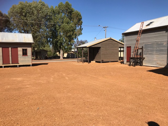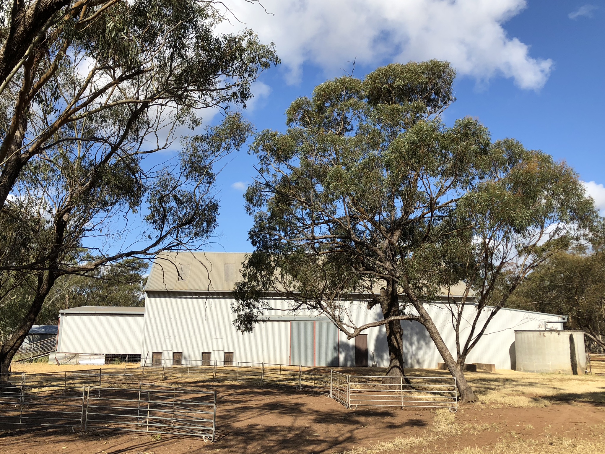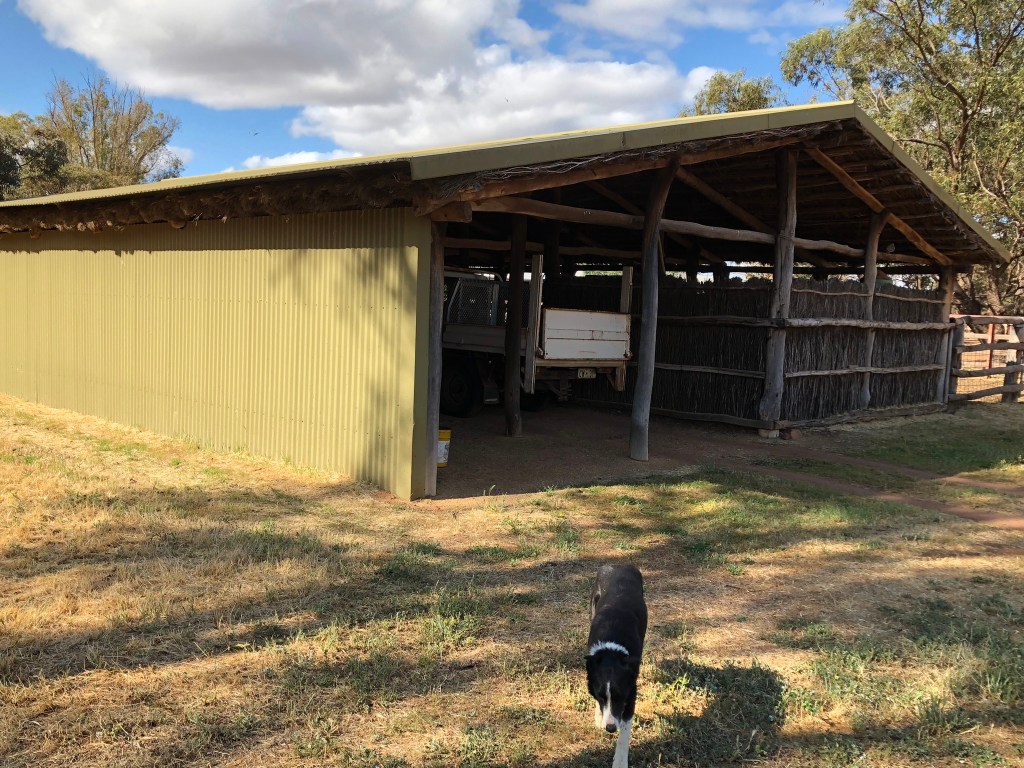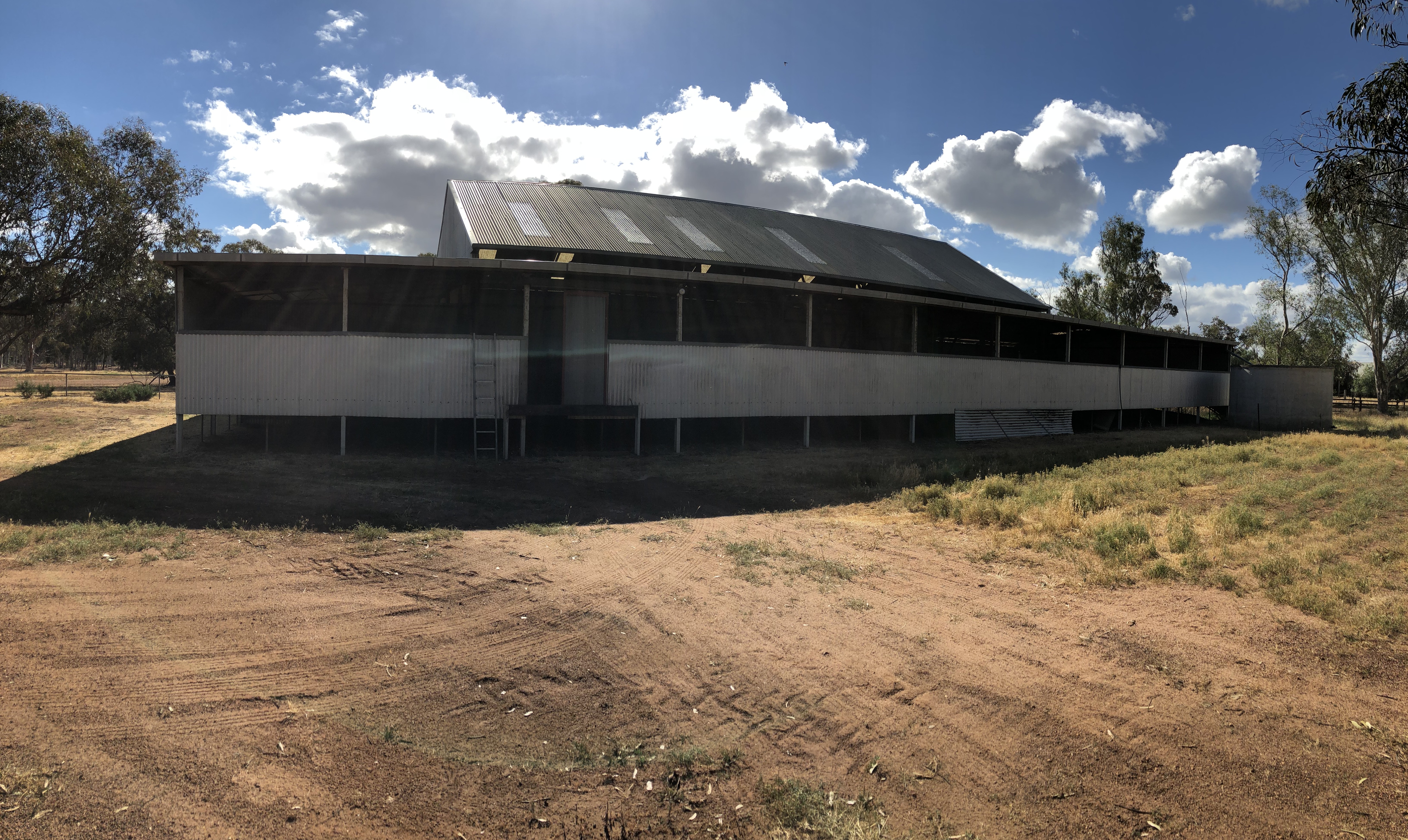 The Shearing Shed is a large rectangular corrugated iron shed with a corrugated iron gable roof. Internally, centrally placed bush poles with a mixture of timber and steel trusses support the roof. Three rows of magnificent salmon gum poles give the shed its height. The north end of the lean-to on the east side was originally fitted out as the blacksmith shop (removed in 1976)