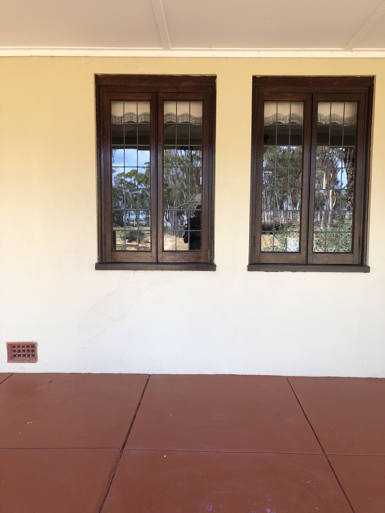 The main entry is to the south is enhanced with a flat roofed verandah supported on eight concrete pillars, and double entry doors. Chimneys are of unusual design with rendered band surrounding. Windows are double hung, timber framed with 12 small panes. A skillion roof to the south covers a sleepout area enclosed with fly wire and blinds. Internally, the rooms are large with high ceilings, some with decorative plasterwork, and all the internal woodwork is made of jarrah.