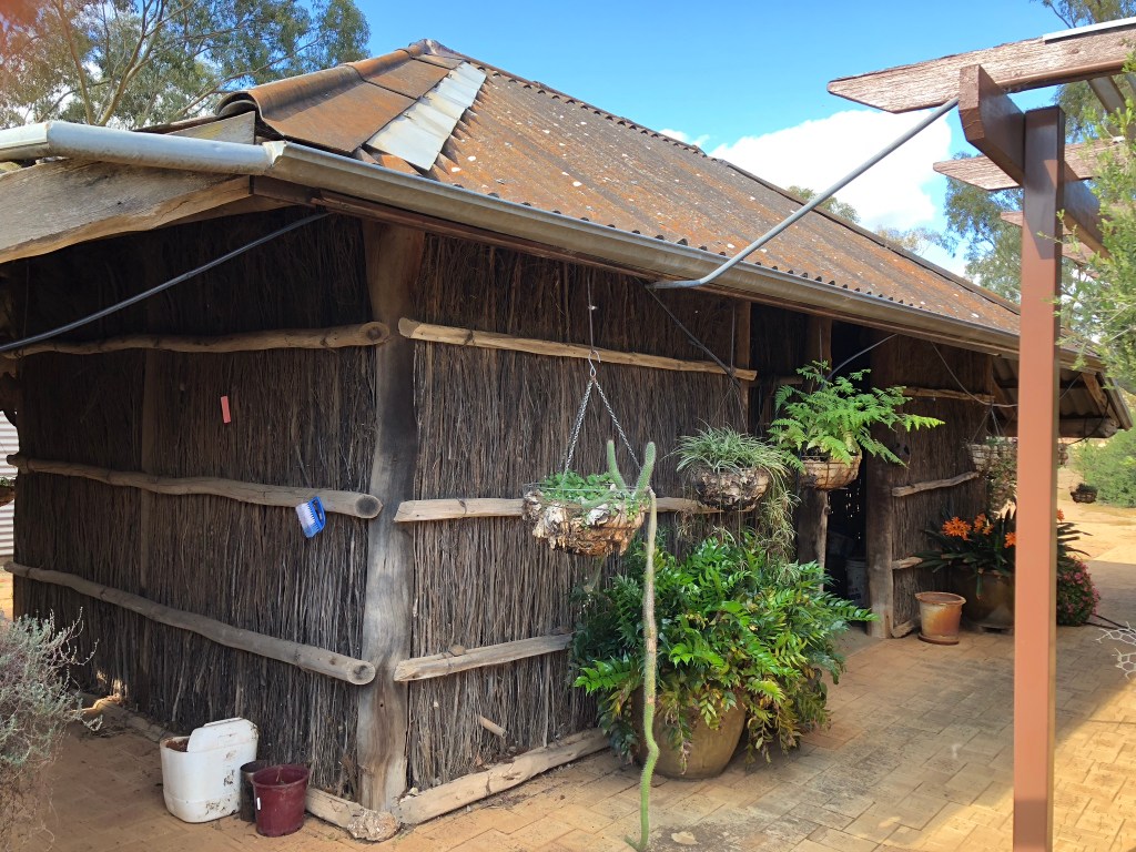 This large rectangular building was constructed in 1910 and originally there were stalls for 12 horses. The uprights are salmon gums, carefully selected with a Y fork, to take the supports for the roof. The purlins are gimlet overlaid with ti tree brush. Ti tree also forms the walls where necessary using gimlet for rails. The roof was thatched with sheaves of cereal rye, grown especially for the purpose. It had to be cut green, before grain formed, to avoid attracting mice. The sheaves were laid in over lapping rows, the butt end to the top. Rabbit netting was fastened over the lower edge of the roof to hold it firm. In latter years the thatching was done approximately every three years by Mr Bill Johns Snr, assisted by two Koobabbie employees. The last thatching was done here in 1962.