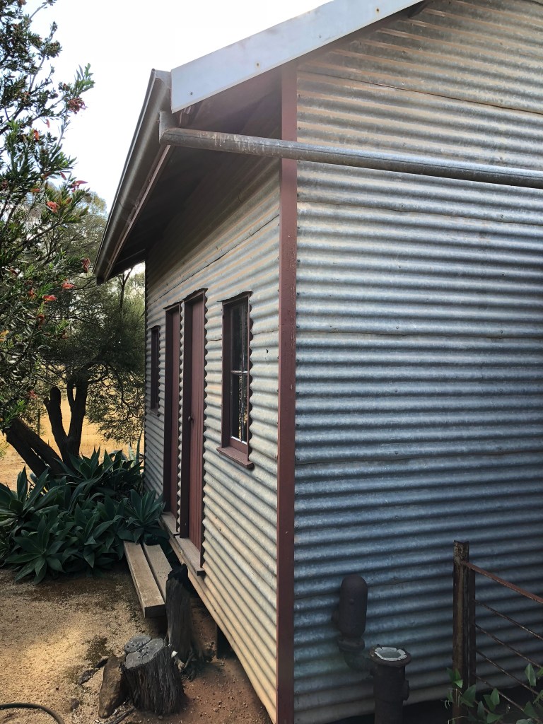 There is a lean-to to the west elevation called the ‘Buggy Shed’ and it was originally used for this purpose but is now just storage. It was open on the south side and had an earth floor. In the 1980s the south wall was constructed with a door made of recycled ripple iron and the floor concreted. The shelves are timber from the original Koobabbie house.
