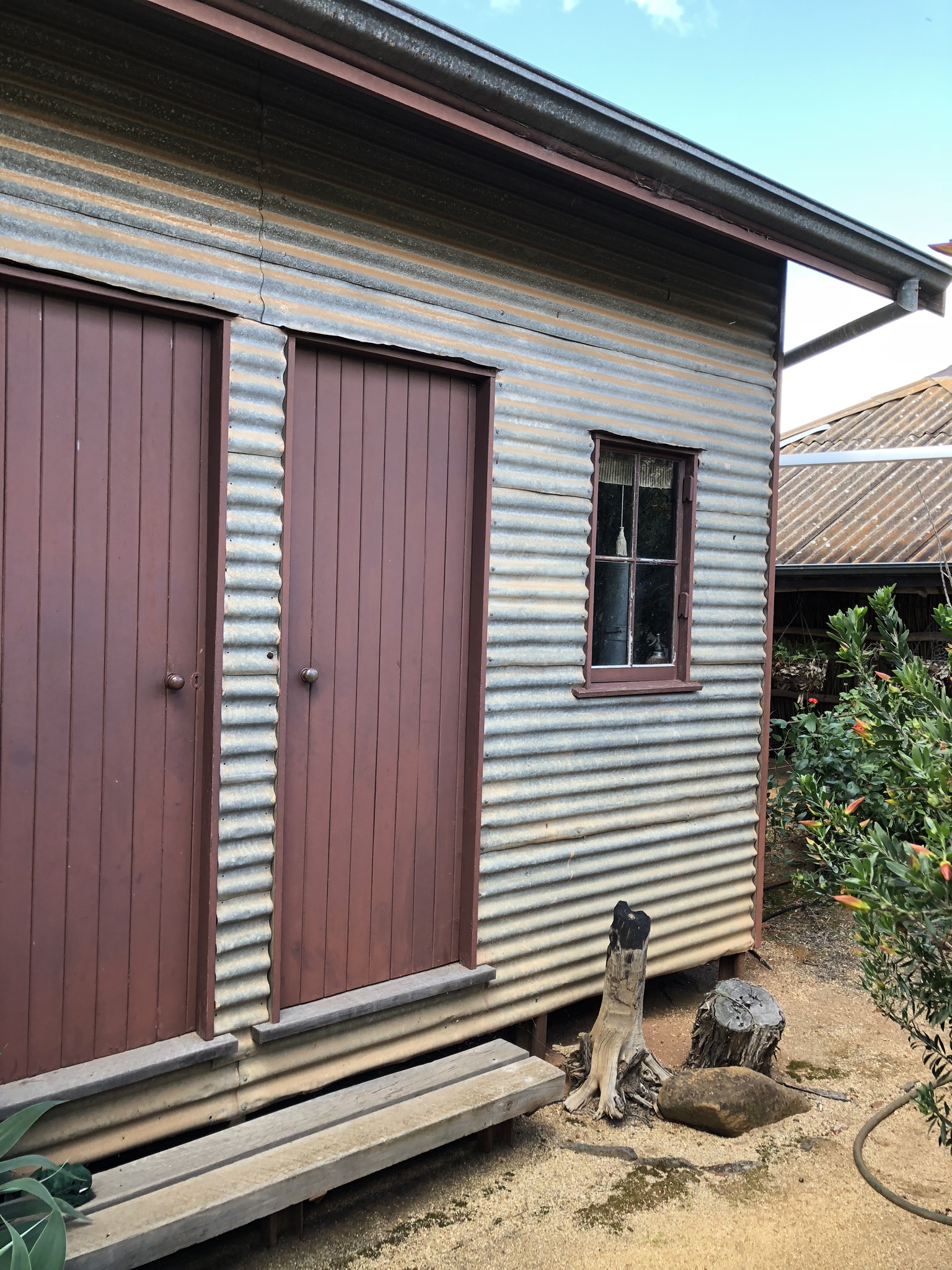 This is a small rectangular building adjacent to, west of the homestead. Roofed and clad with corrugated iron and now set on railway iron stumps, the building is divided into two sections. Each section has a single entry door with a four paned timber framed window to both the north and south elevation. The maid’s room to the east has a timber ceiling, and was the only one ever occupied by a maid, who must have found it very cold in winter, and very hot in summer. The other section is unlined and has only ever been used for storage.